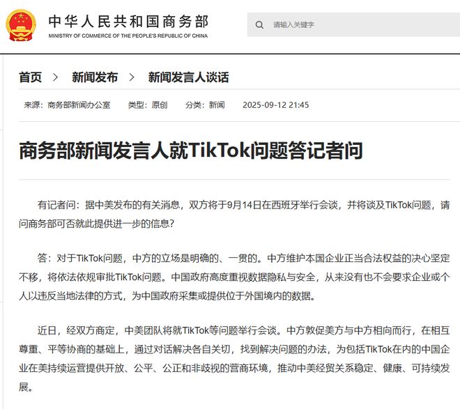 有记者问:据中美发布的有关消息,双方将于9月14日在西班牙举行会谈,并将谈及TikTok问题,请问商务部可否就此提供进一步的信息?
